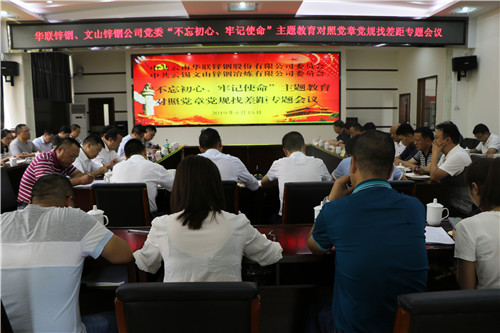 8月15日,華聯鋅銦、文山鋅銦黨委在華聯鋅銦五樓會議室召開對照黨章黨規找差距專題會議,以正視問題的自覺和刀刃向內的勇氣,逐一對照、全面查找各種違背初心和使命的問題,真刀真槍解決問題。控股公司黨委主題教育第八指導組副組長楊滿昌到會指導,華聯鋅銦、文山鋅銦公司黨委書記、董事長張學平主持會議。