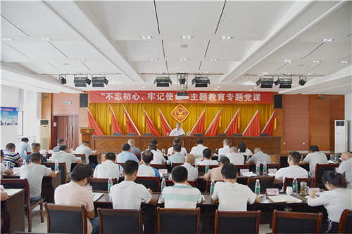 控股公司主題教育第七指導組組長湯發到會指導,郴州公司領導班子成員、各支部在崗黨員、入黨積極分子和職工代表共50人聆聽黨課。(唐四英)