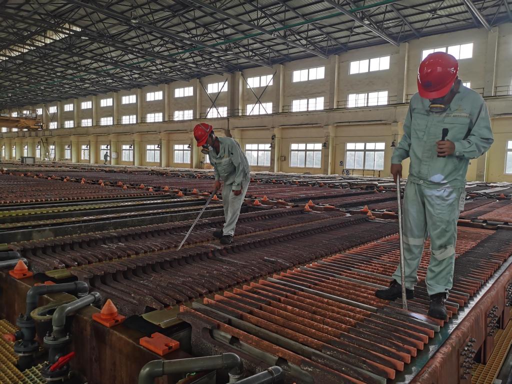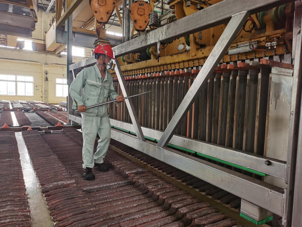 不一會(huì),電解槽面上的工作開(kāi)始了,遠(yuǎn)遠(yuǎn)望去,只見(jiàn)他們?cè)诓勖嫔喜煌5貋?lái)回走動(dòng),手里拿著工具敲打著陽(yáng)極板。裝槽,需要把槽間銅排沖洗干凈,調(diào)整進(jìn)液管,確保進(jìn)液管保持在電解槽中心線,再指揮行車工將陽(yáng)極板吊裝入槽。廠房外外火辣辣的太陽(yáng)照著,廠房?jī)?nèi)約38℃的槽面溫度,戴上3M面具,整個(gè)人就像“蒸桑拿”,他們手拿工具,當(dāng)起檢測(cè)員,在槽面上對(duì)入槽的每一塊陽(yáng)極板進(jìn)行認(rèn)真檢查,間距、相鄰兩陽(yáng)極板中心距約是否符合要求,用“火眼金睛”排畸,身上的衣服更是濕了干,干了濕,額頭上豆大的汗珠不間斷的往下流。他們來(lái)不及休息,為的是第一時(shí)間把陽(yáng)極板入槽,為后續(xù)工作爭(zhēng)取時(shí)間;他們仔細(xì)察看每一塊陽(yáng)極板狀況,只為能保證產(chǎn)品質(zhì)量。