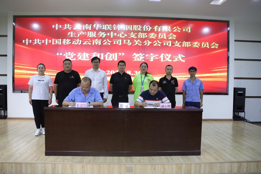8月30日,華聯鋅銦生產經營黨支部與中國移動馬關分公司現場舉行“黨建和創”簽字儀式,共同開展“黨建和創”活動,以“優勢互補、互惠互利、共同發展、合作共贏”的原則,充分發揮黨建和創作用,提升黨建工作水平,建立業務聯系。