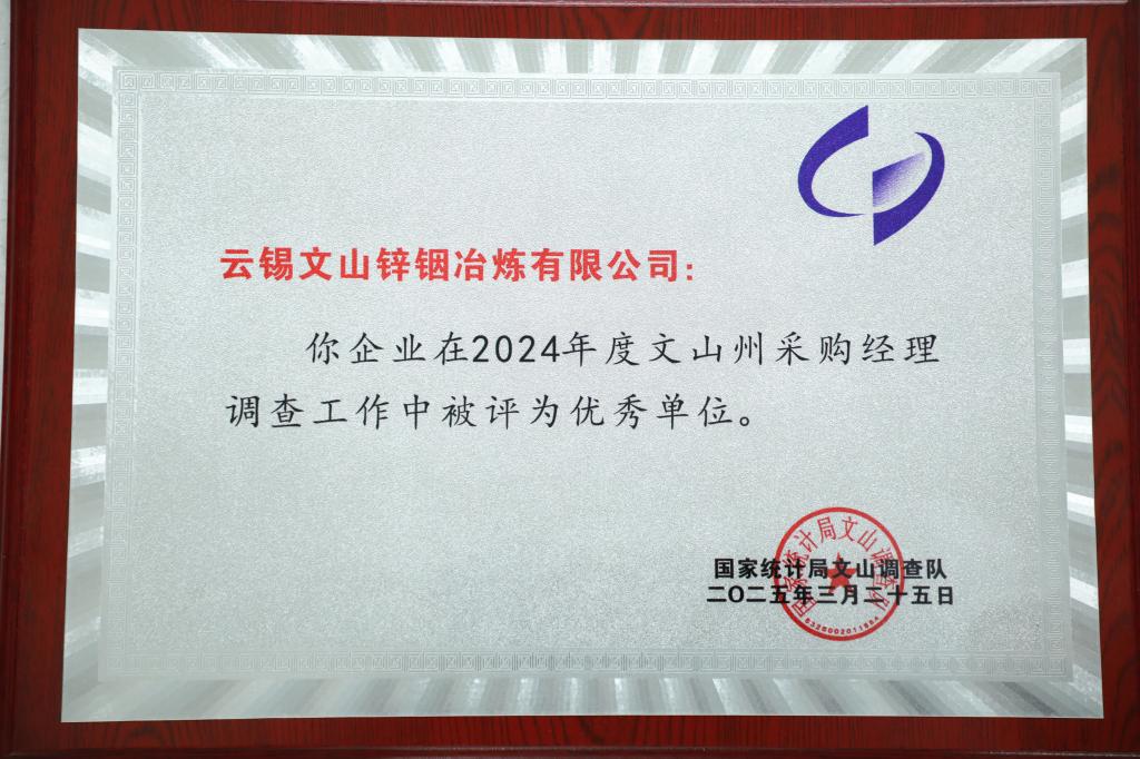 近日,國家統(tǒng)計局文山調(diào)查隊公布2024年度文山州采購經(jīng)理調(diào)查工作優(yōu)秀單位評選結(jié)果,文山鋅銦公司憑借在采購經(jīng)理調(diào)查工作中的突出表現(xiàn),獲“2024年度文山州采購經(jīng)理調(diào)查工作優(yōu)秀單位”稱號。