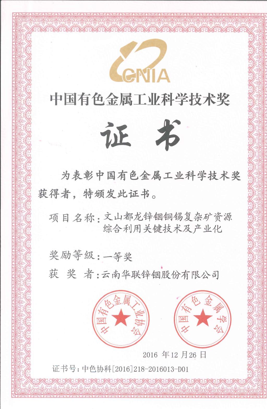 2011年以來累計投入科研資金3.4億元,實現科技創效4.74億元,取得了顯著的科技成果,其中,“銦鋅錫銅復雜多金屬礦資源高效綠色利用關鍵技術及產業化示范項目”榮獲2017年度中國循環經濟協會科學技術一等獎;“銦鋅錫銅共伴生多金屬礦資源高效利用關鍵技術及產業化項目”榮獲云南省科技進步一等獎;“文山都龍鋅銦銅錫復雜礦資源綜合利用關鍵技術及產業化項目”榮獲中國有色金屬工業科學獎一等獎。