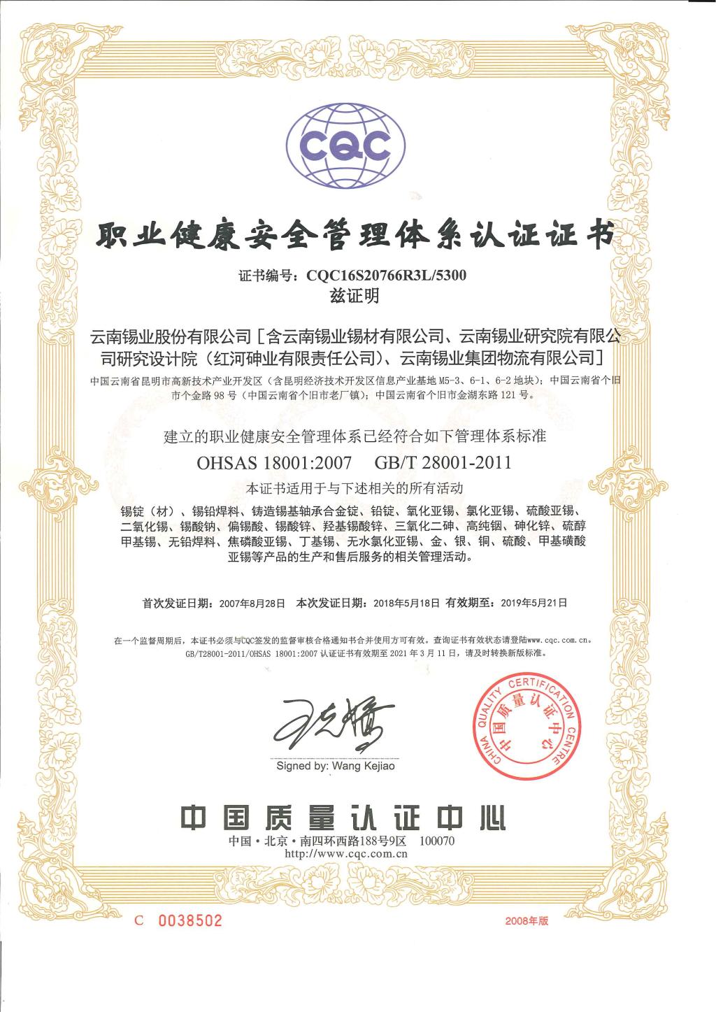 近日,錫業(yè)股份質(zhì)量、環(huán)境管理體系通過新版ISO9001:2015、ISO14001:2015標(biāo)準(zhǔn)換版認(rèn)證審核,職業(yè)健康安全管理體系通過OHSAS18001:2007標(biāo)準(zhǔn)年度監(jiān)督審核,獲得證書。