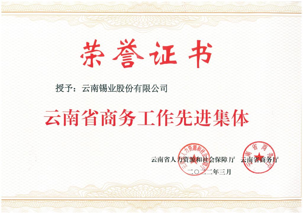 為樹立典型、弘揚先進、凝聚力量、激勵擔當,引領全省廣大商務系統干部職工奮斗新時代、奮進新征程、擔當新使命,云南省商務廳和云南省人力資源和社會保障廳2021年12月決定開展每五年評選一次的云南省商務工作先進表彰活動。本著堅持面向基層,堅持評選標準、依法依規推薦等原則,以推動商務工作高質量發展為導向,以帶動經濟社會發展實績為衡量標準,經過耗時4個月的評選,云南省商務廳和云南省人力資源和社會保障廳決定授予云南錫業股份有限公司“云南省商務工作先進集體”稱號 。