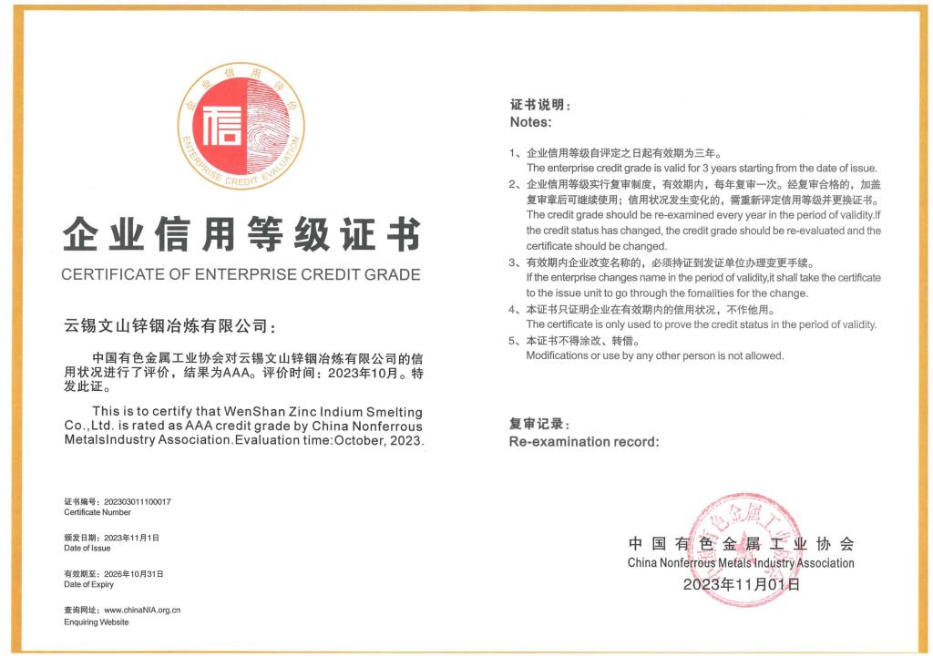 近期,文山鋅銦公司獲得中國有色金屬工業協會“AAA級信用企業”證書,得到行業協會權威認證,標志著文山鋅銦公司在誠信經營、規范經營等方面取得重要階段性成果。
