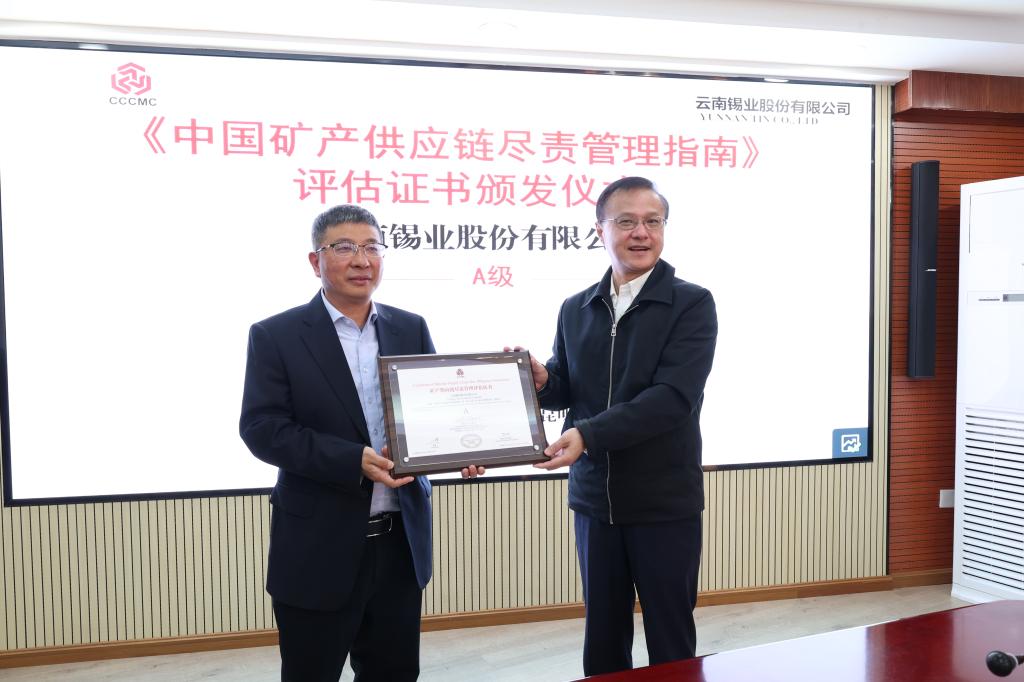 近日,中國五礦化工進出口商會會長江輝、發展部主任孫立會,及倫敦金屬交易所負責任工商經理楊茗友一行到訪云錫,與云錫控股公司領導楊奕敏、錫業股份黨委書記、董事長、總經理劉路坷開展座談,并向錫業股份頒發《中國礦業供應鏈盡責管理指南》評估證書。