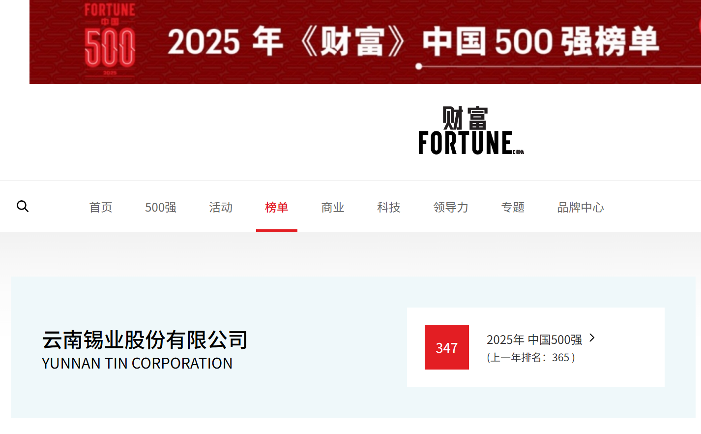 7月22日,2025年《財(cái)富》中國500強(qiáng)排行榜發(fā)布,錫業(yè)股份位居第347位,較去年排名上升18位。